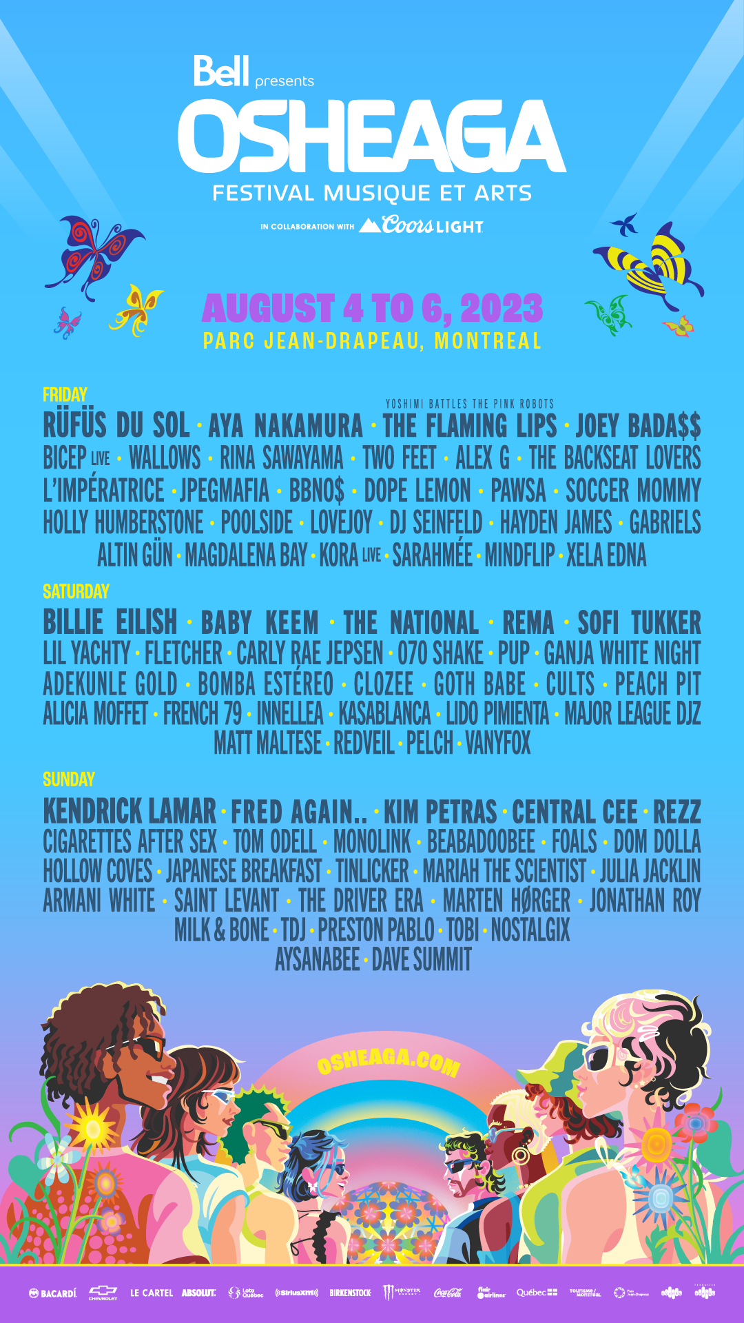 Osheaga 2023 Where Parc Jean Drapeau, Montreal Map When Aug 04/23 04:00 PM - Aug 06/23 11:00 PM Age All Website https://www.osheaga.com/en