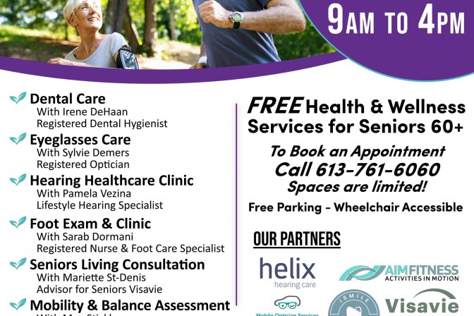 FREE day of health and wellness care for Seniors 60+! Local Professional business owners are collaborating together to create a wonderful day aimed helping Seniors in need. Space is limited, call 613-761-6060 for appointment! Available No-Cost Services: Dental Care with Irene DeHaan, Registered Dental Hygienist, iSmile Ottawa. Foot Exams and Clinic with […]