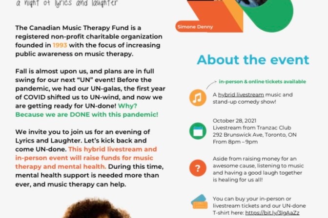 Tranzac Club, 292 Brunswick ave., Toronto, Ontario, Canada The Canadian Music Therapy Fund is a registered non-profit charitable organization founded in 1993 with the focus of increasing public awareness on music therapy. fall is almost upon us, and plans are in full swing for our next “UN” event! Before the pandemic, we had UN-galas, the first year of COVID shifted us into UN-wind, […]