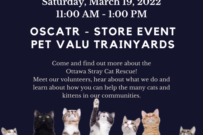 Pet Valu Trainyards It is a busy time for the Ottawa Stray Cat Rescue (https://oscatr.ca) Volunteers these days! The work never stops but with the coming “kitten season” fundraising is critical to help pay for the medical expenses and care for the hundreds of cats that they save. Currently there is the “Winter Blues” Sponsorship campaign to cover the cats currently in […]