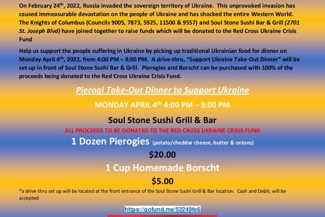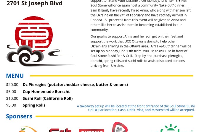 Soul Stone Sushi Bar & Grill, 2701 St Joseph Blvd, Orleans Support For Ukraine Event in Orleans on Monday June 13, 2022 at the Soul Stone Sushi Bar & Grill from 3:00 PM to 8:00 PM. Proceeds from this event will remain local and be dispersed amongst Ukrainians recently displaced from the Ukraine and arriving in Ottawa.