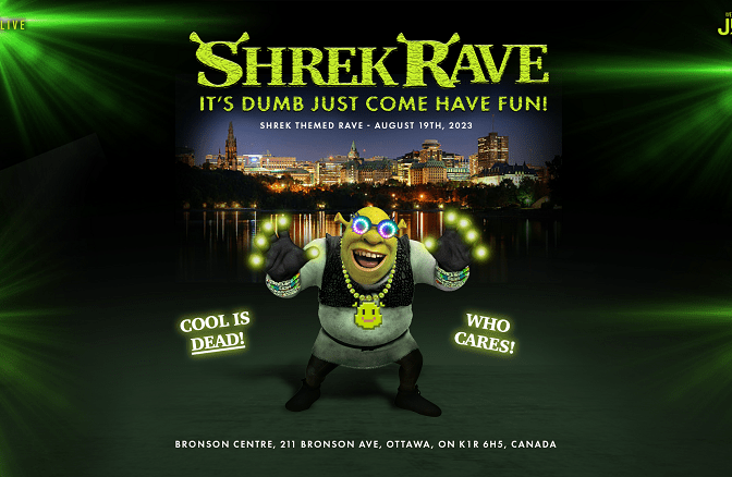 Bronson Centre Music Theatre, 211 Bronson Ave, Ottawa MODO-LIVE Presents Shrek Rave 19+ Sat Aug 19th, 7pm, 19+ ID required SHREK RAVE RETURNS TO OTTAWA! Unleash your inner ogre on Aug 19th at Bronson Centre! IT’S DUMB JUST COME HAVE FUN. WHO CARES. COOL IS DEAD. Tickets are on sale now.